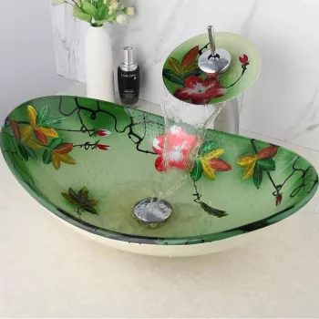 Hand-Painted Art Glass Bathroom Sink with Waterfall Faucet and Chrome Drain