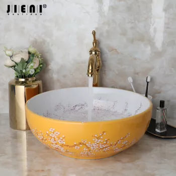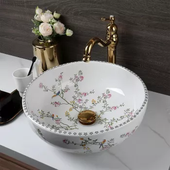 Round Ceramic Bathroom Basin Set with Art Flower Pattern and Golden Faucet