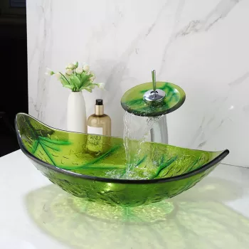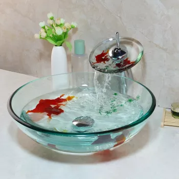 Tempered Glass Vessel Sink with Waterfall Chrome Faucet - Goldfish Art Basin Set