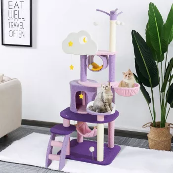 65-Inch Cute Cat Tower with Cloud Design, Scratching Posts, and Play Areas