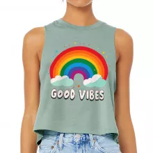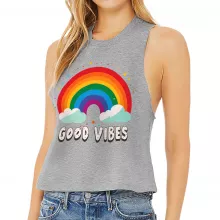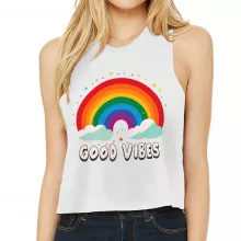 Use our battle tested marketing materials for Good Vibes Racerback Cropped Tank - Rainbow Women's Tank - Colorful Tank Top