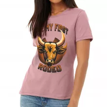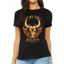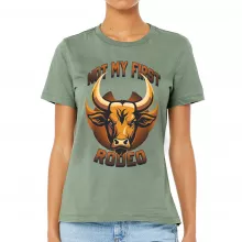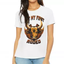 Use our battle tested marketing materials for Not My First Rodeo Women's T-Shirt - Bull Design T-Shirt - Cool Graphic Relaxed Tee