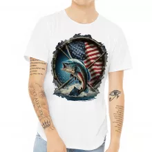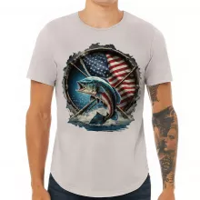 Use our battle tested marketing materials for Flag Behind Bass Fishing Curved Hem T-Shirt - Patriotic T-Shirt - Cool Curved Hem Tee