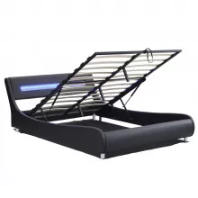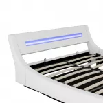 Our bed boasts a fully upholstered frame, lending a sleek and sophisticated touch to your bedroom. The highlight, an innovative LED-lighted headboard, offers adjustable lighting with 20 color options, controlled remotely for your convenience. This feature not only adds ambiance to your room but also serves as a practical light source. The bed's curved, low-profile metal frame is wrapped in faux leather, adding a luxurious texture and feel.