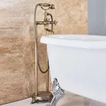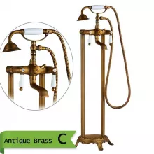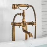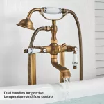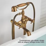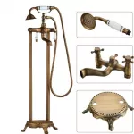 Introducing the pinnacle of bathroom luxury and design - our Dual-Handle Bathroom Floor Mount Bathtub Filler. Crafted for those who appreciate the finer details, this freestanding faucet with an antique brass finish promises to elevate your bathroom's aesthetic and your daily ritual. The rotating spout and handheld shower head blend convenience with timeless style, ensuring a bathing experience that is as relaxing as it is refined.