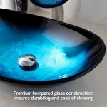The product's basic features include a luxury oversized glass sink, a single-hole faucet mount for easy installation, and a durable chrome pop-up drain. Crafted from premium quality tempered glass, this basin set is not only stunning but also robust and long-lasting. The above-the-counter installation design ensures a seamless integration into your existing space, creating a modern look that elevates the overall ambiance of your bathroom.