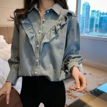 Use our battle tested marketing materials for Elegant Ruffle Denim Blouse - Casual Princess Sleeve Jean Shirt for Women