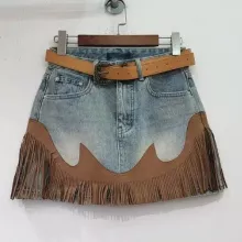 What sets this skirt apart is the attention to detail in its design. The contrast color splicing elevates it from a simple denim skirt to a statement piece. The playful tassels infuse a sense of fun and flair, and the pockets add a practical touch to its stylish form. All these elements come together to create a garment that doesn't just fit into your wardrobe – it elevates it.