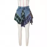 What sets this skirt apart is its unique patchwork design—combining the rebellious vibe of denim with the timeless elegance of plaid. The irregular hemline and streamer detail add an unexpected twist, making it a standout piece that's sure to turn heads. The juxtaposition of patterns and textures captures a contemporary trend while maintaining a classic edge that will endure season after season.