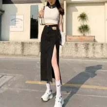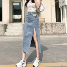 Use our battle tested marketing materials for Summer Vintage Denim Maxi Skirt with Side Split - Casual Long Jean Skirt