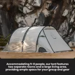 - Spacious Design: Accommodating 5-8 people, our tent features two separate rooms and a large living area, providing ample space for your group and gear.
