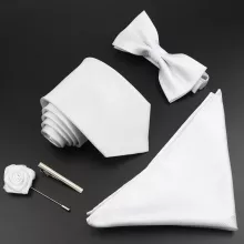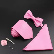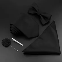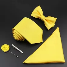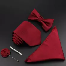 Each set includes a meticulously crafted necktie, a stylish bow tie, a matching handkerchief, and an ornate brooch to complete your look. Made from high-quality polyester with a luxurious silk feel, these accessories promise both comfort and durability. Available in a wide range of colors, these sets cater to individual preferences while maintaining a timeless charm.