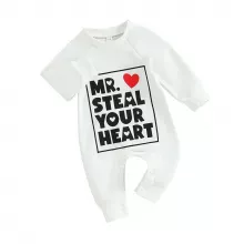 What sets this romper apart is its unique combination of playful design, comfort, and practicality. The heart print and "mr steal your heart" phrase add a touch of whimsy, making your little one the center of attention. The high-quality material blend provides both durability and comfort, ensuring your baby feels as good as they look.