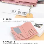 Whether you're running errands, heading out for a night on the town, or traveling, this wallet is your go-to accessory. Its short length and lightweight design ensure it won't weigh you down, while the array of interior compartments keeps your items neatly organized. The combination of zipper and hasp closure offers double the security for your valuables. Plus, the added wristband not only enhances its fashionable look but also provides a practical way to carry your wallet hands-free.