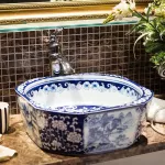 Each sink is meticulously crafted from high-quality ceramic, ensuring durability and a long-lasting shine. The intricate blue and white patterns are hand-painted, giving each piece a unique and luxurious look. The oval shape provides a contemporary touch, making it a versatile addition to both traditional and modern bathroom settings.