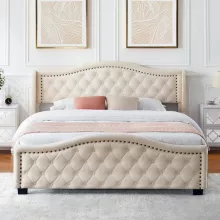 Transform your bedroom into a luxurious retreat with our Queen Size Bed Frame featuring a grand 47.2" tall wingback headboard. This exquisite bed combines elegance and functionality, providing excellent support for your head and shoulders while adding a sophisticated touch to your décor. The intricate detailing, button tufts, and elegantly curved edges create a lavish and comfortable atmosphere, making it the perfect centerpiece for any bedroom.
