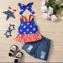 Use our battle tested marketing materials for Independence Day Toddler Girl Bow Headband, Camisole, and Ripped Denim Shorts Set