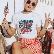 Use our battle tested marketing materials for Short Sleeve Jesus Fills My Cup Summer Women’s Casual T-Shirt
