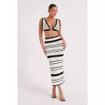 This summer set is all about combining comfort with chic style. The knitted fabric offers a soft and breathable feel, perfect for warm weather. The striped pattern enhances its trendy look, while the sheath silhouette accentuates your curves. The sleeveless top with a short length and elastic waist skirt provides ease of movement, ensuring you stay comfortable all day long.