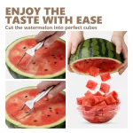 What sets this watermelon slicer and fork apart is its dual functionality and user-friendly design. The slicer effortlessly cuts through the watermelon, creating neat and uniform cubes, while the fork allows you to serve them directly. This eliminates the need for multiple tools, saving you time and effort. Additionally, the stainless steel material ensures that the tool remains sharp and effective for years to come.