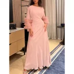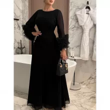 This maxi dress is a masterpiece of design, featuring flared long sleeves that add a touch of drama and movement. The O-neckline offers a classic appeal, while the ankle-length silhouette provides a graceful flow. With slight stretch in the fabric, the dress offers ease of movement and a comfortable fit, making it perfect for any activity, from dancing the night away to a relaxed evening out.