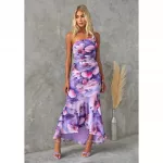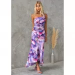 What makes this dress truly special is its combination of classic elegance and modern style. The off-shoulder design and asymmetric hemline create a unique and eye-catching look, while the floral print adds a fresh and vibrant feel. The high waist and backless detail provide a flattering and feminine touch, ensuring you feel confident and beautiful at any event.