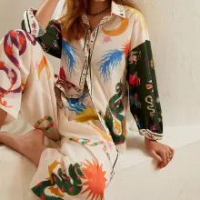 Crafted from high-quality polyester with a slight stretch, this set offers a relaxed fit that flatters all body types. The laminated fabric and vintage print add a touch of sophistication, while the turn-down collar and single-breasted closure on the shirt exude timeless elegance. The elastic waistband on the pants ensures a comfortable fit, making this set ideal for all-day wear.