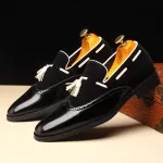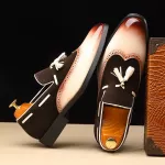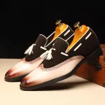 Make a bold statement with these Business Vintage Men's Mixed Color Leather Tassel Loafers. Designed for the modern gentleman with a taste for classic elegance and contemporary flair, these loafers effortlessly combine the timeless charm of brogue shoes with a fresh, vibrant mix of colors. Whether you're attending a wedding, formal event, or simply want to elevate your everyday business look, these slip-on loafers are the perfect addition to your wardrobe. Crafted with premium split leather and detailed with stylish tassels, these loafers exude sophistication. The pointed toe and brogue-inspired detailing add a refined touch, while the mixed colors provide a unique, eye-catching finish. The slip-on design ensures convenience, and the durable rubber outsole gives you the confidence to walk with ease, no matter where your day takes you.Key Features