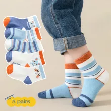 Introduce your child to the delightful world of comfort with our 5 Pairs Cartoon Striped Kids Socks. Perfectly designed for the autumn and winter seasons, these mid-tube socks combine warmth and playful style. Crafted from a cozy blend of cotton and polyester, they are ideal for kids aged 8 months to 13 years, providing a snug fit that keeps little feet warm during chilly days.