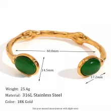 Add a touch of nature-inspired elegance to your look with this captivating 18K gold-plated Green Agate Crystal Bracelet. Featuring a stunning open, irregular design that combines the beauty of natural green agate with the sleekness of tarnish-free stainless steel, this bracelet is designed for women who appreciate unique, high-quality jewelry. The eye-catching geometric pattern of the agate stone stands out beautifully against the polished gold finish, creating a sophisticated piece that is versatile enough to wear day or night. Whether paired with a casual outfit or an evening dress, this bracelet will elevate your style and make a statement.