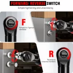 This cordless ratchet wrench is designed for both professional mechanics and DIY enthusiasts. Its compact, 90° angle head allows you to access narrow spaces, making it ideal for automotive repairs, bike maintenance, scaffolding installation, and household projects. Equipped with a forward and reverse switch, you can easily toggle directions for both tightening and loosening bolts, giving you full control over every project.