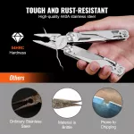 This multi-tool is designed for versatility and durability, making it an invaluable companion for outdoor adventures, home repairs, and everyday tasks. Its high-quality stainless steel build guarantees performance and durability, while the auto-locking feature ensures your safety during use. The 17 functions cover a broad range of needs, from tightening screws to cutting through wood. Lightweight, compact, and easy to carry, it’s perfect for those who value practical solutions in a compact form.