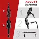 - Comprehensive 7-Piece Set: Includes four countersink drill bits (#4, #6, #8, #10), a 3/8" wood plug cutter, a depth stop collar, and an Allen key for adjustment.
