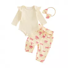 Use our battle tested marketing materials for Baby Girl 3-Piece Fall Outfit - Ribbed Romper + Bow Print Pants + Headband Set