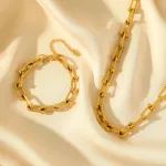 Make a statement with the **316L Stainless Steel Gold Thick Chain Necklace & Bracelet Set**, designed for women who love modern, edgy accessories. This trendy jewelry set features a chunky gold chain with a sleek geometric pattern, perfect for elevating any outfit. Whether you’re heading to a party, celebrating a special occasion, or adding a touch of luxury to your everyday look, this set is versatile, durable, and undeniably stylish. Its waterproof design ensures long-lasting beauty, making it a must-have addition to your jewelry collection.
