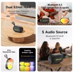 Equipped with IPX5 waterproof protection, this speaker is ready to face the elements—rain, splashes, and spills. It’s perfect for your outdoor adventures, whether you’re at the beach, hiking, or camping. The compact size, lightweight design, and versatile connectivity options, including Bluetooth, AUX, FM radio, and USB/SD card support, make this speaker your ultimate portable sound companion.