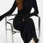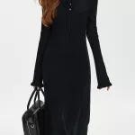 This black knitted dress is more than just a piece of clothing—it’s a statement of refined taste and comfort. Its A-line silhouette flatters every body type, while the fungus edge detail adds a touch of whimsy to its elegant design. Whether you’re heading to work, attending a dinner party, or enjoying a casual outing, this dress adapts to any occasion. The medium-stretch fabric ensures a snug yet comfortable fit, while its solid black color provides versatility for endless styling possibilities.