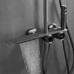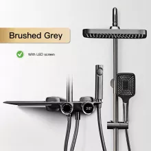 Elevate your shower experience with this stunning luxury gun gray brass shower system. Designed to combine sophistication with functionality, this shower system offers a sleek digital display and an elegant waterfall water outlet. The perfect fusion of modern aesthetics and practical features, it’s a must-have addition for any contemporary bathroom.