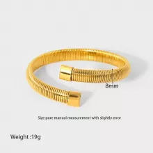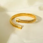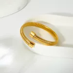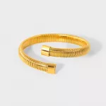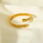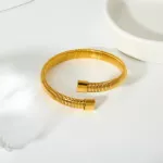 This bracelet combines beauty and functionality, making it the perfect accessory for any occasion. Its sleek and modern design features a delicate open texture that adds sophistication to your look without being overpowering. The PVD 18K gold plating not only ensures a luxurious finish but also makes it resistant to tarnishing, so it retains its radiant shine even with frequent wear. Lightweight and comfortable, this bangle is perfect for women who want a piece of jewelry that works seamlessly with both casual and formal outfits.