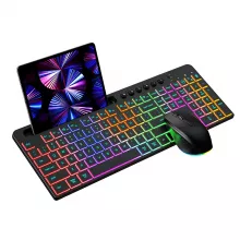 Loaded with features, this keyboard and mouse combo is designed to enhance your efficiency and comfort. The keyboard features 114 keys, a soft typing experience, and adjustable rainbow backlighting for nighttime use. A built-in 7.79-inch phone and tablet holder keeps your devices accessible for multitasking. The mouse, equipped with silent clicks and a 500mAh rechargeable battery, ensures smooth and quiet operation. Both devices connect wirelessly through 2.4G technology, offering a stable and clutter-free setup.