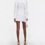 The La Robe Bahia Dress boasts a classic collar and a wide asymmetrical neckline, exuding an air of effortless chic. The front closure with concealed buttons adds a sleek, minimalist touch, while the knotted smock stitch detail at the waist enhances the dress's structured yet relaxed look. The adjustable button cuffs and asymmetrical hemline offer a perfect balance between elegance and modern style. Finished in a monochrome pattern, this dress provides a versatile base for any occasion, from casual outings to more formal affairs.