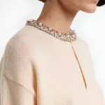 - Neckline: Ribbed crew neck embellished with stones and pearls for a luxurious touch.