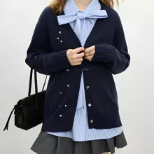 Use our battle tested marketing materials for Elegant Navy Blue Wool Blend Cardigan – V-Neck, Nail Bead Detail, Spring Knit