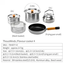 Crafted from high-quality 304 stainless steel, this cookware set is built to last and withstand the toughest outdoor conditions. The set includes everything you need: pots in various sizes (1.3L, 2L, 3.8L, and 6.5L), a frying pan, mesh basket, and more. All items are easy to clean, portable, and come with a convenient mesh bag for simple storage and transport. Whether you're cooking over a campfire or using a stove, this versatile set is a must-have for any outdoor cooking enthusiast.