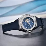 The sleek rubber band offers both comfort and flexibility, while the sapphire glass keeps the dial scratch-free, maintaining its clarity and shine. What sets this watch apart is its self-winding movement that eliminates the need for battery replacements, providing a seamless and eco-friendly timekeeping experience.