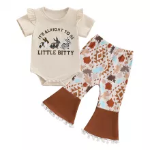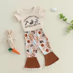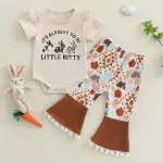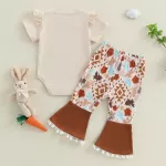 What makes this Easter set extra special is the perfect mix of comfort, functionality, and holiday charm. The romper’s soft material ensures all-day comfort, while the flare pants add a fashionable twist your little girl can twirl in. With a lovely bunny and cheerful letter design, it captures the spirit of Easter while staying wearable for the rest of the season. This set is best used during springtime, especially for Easter celebrations, baby photo shoots, birthday parties, or casual family outings. The neutral khaki tones combined with a playful pattern make it easy to accessorize with bows, shoes, and jackets. It’s cute enough to stand out, but comfy enough for everyday wear.Make Easter Extra Special