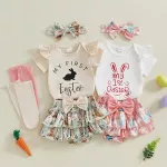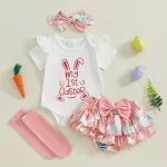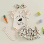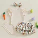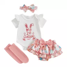 Get your baby girl dressed for Easter in the most adorable way with this Baby Girl Bunny Easter Outfit. This charming four-piece set includes a soft short sleeve romper with a cute bunny print, layered ruffle shorts, a matching bow headband, and a pair of cozy socks—everything you need for a picture-perfect spring day. Whether it’s her first Easter or a family gathering, this outfit blends comfort and cuteness with ease.