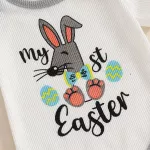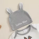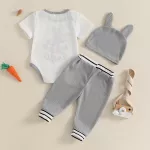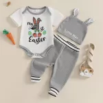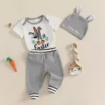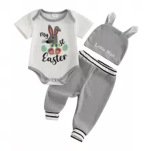 Celebrate your baby boy's first (or second!) Easter in style with this irresistibly cute 3-piece outfit set. Featuring a soft short sleeve romper with a cheerful bunny and letter print, matching striped cuff long pants, and an adorable hat to complete the look — this outfit is made for memories, giggles, and photos you'll cherish forever. Designed for comfort and convenience, this set is crafted from a high-quality cotton blend that’s gentle on delicate skin. The romper’s pullover design and O-neck collar make dressing a breeze, while the stretchy waistband on the pants ensures a snug yet cozy fit for crawling, playing, or napping. Whether it’s Easter brunch, a family gathering, or a spring photo shoot, your little one will look as sweet as the season itself.Product Features