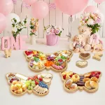 Made from natural wood, this tray is both lightweight and durable, offering a warm, rustic finish that complements a wide range of party themes and home décor styles. Measuring approximately 10 inches wide, it's the perfect size for holding snacks, candy, fruits, or even small baked goods. The butterfly wings are subtly sectioned, making it easy to display different treats while adding a decorative element to your setup.