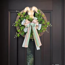 Carefully designed to reflect the spirit of Easter, this decorative wreath is made from high-quality plastic, wood, and fabric materials, ensuring durability and long-lasting use. The intricate details, including the lifelike bunny and soft checkered bow, add a whimsical and welcoming touch to your home or storefront.